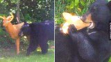 เจ้าหมีดำตัวนี้เห็นเหยื่อปุ๊ปก็รีบวิ่งเข้าไปทันที พอกัดหัวกวางเข้าไปหนึ่งคำ…..โศกนาฏกรรมก็เกิดขึ้น