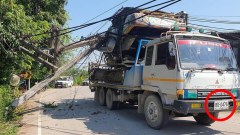 รถบรรทุก 10 ล้อ บรรทุกรถเกี่ยวข้าวเกี่ยวสายไฟฟ้าแรงสูงล้มทับขวางถนน