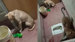 สุนัขจรจัดผู้น่าสงสาร ติดอยู่ในห้องน้ำกับเสือดาวแบบ 2 ต่อ 2 (มีคลิป)