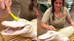 น่ารักเกินปุยมุ้ย! "สวนสัตว์แคลิฟอร์เนีย" เผยคลิป จนท.อาบน้ำให้ "จระเข้เผือก"