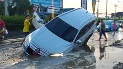 ใจหายแว๊บ! ปาเจโร่หัวทิ่มลงหลุมบนถนน