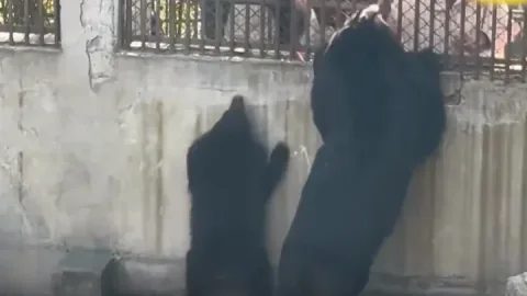 น่าเอ็นดู!! เมื่อลูกหมีอยากทักทายนักท่องเที่ยว แต่กำแพงมันสูงเกินไป กระโดดโหยงๆ เลย