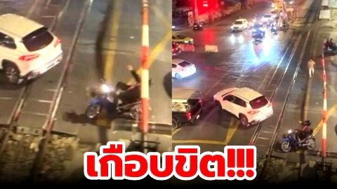 เตือนไม่ฟังเกือบขิตซ่ะแล้ว! จยย.ฝ่าด่านข้ามทางรถไฟ