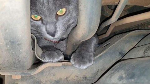 แมวสีสวาด ไล่จับหนูติดใต้ท้องรถออกไม่ได้