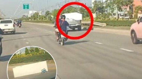 เตือนไม่ฟัง! ปิกอัพขนตู้ไม่ยอมมัด ก่อนร่วงกลางถนน