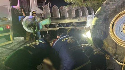 รถไถเสียหลักตกข้างทาง! พลิกคว่ำทับร่างคนขับ คอหักเสียชีวิตคาที่