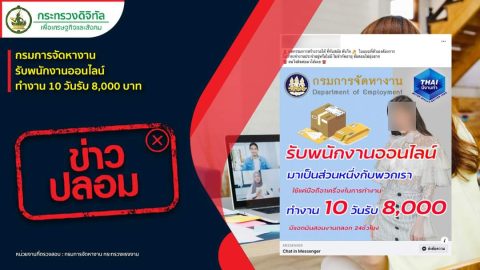 ข่าวปลอม อย่าแชร์! ❌ กรมการจัดหางานรับพนักงานออนไลน์ ทำงาน 10 วันรับ 8,000 บาท