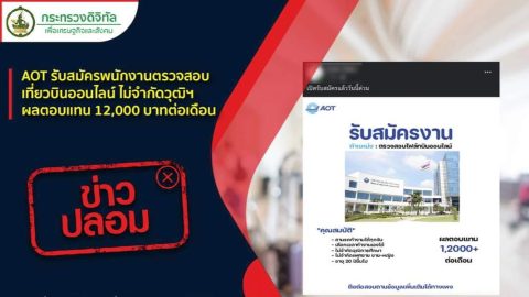ข่าวปลอม อย่าแชร์! ❌ AOT รับสมัครพนักงานตรวจสอบเที่ยวบินออนไลน์ ไม่จำกัดวุฒิฯ ผลตอบแทน 12,000 บาทต่อเดือน