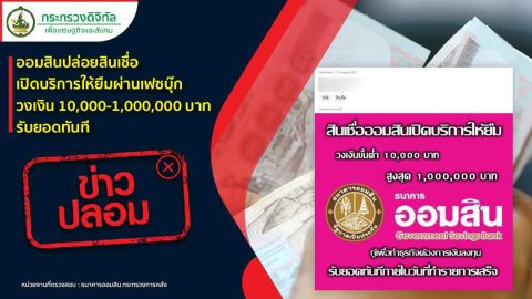 ข่าวปลอม อย่าแชร์! ❌ ออมสินปล่อยสินเชื่อเปิดบริการให้ยืมผ่านเฟซบุ๊ก วงเงิน 10,000-1,000,000 บาท รับยอดทันที