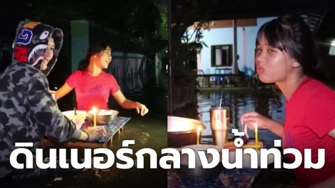หนึ่งปีมีครั้งหนึ่ง! คู่รักหนุ่มสาวดินเนอร์กลางน้ำท่วม