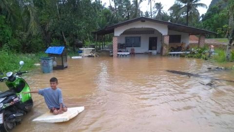พังงา ฝนตกหนักติดต่อกันหลานวันแม่น้ำพังงาระบายลงสู่ทะเลเอ่อล้นไหลท่วมบ้านเรือนประชาชนหลายครัวเรือน