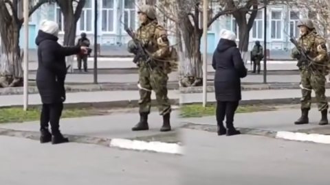 หญิงชาวยูเครนเผชิญหน้า ด่ากราดทหารรัสเซียที่ติดอาวุธ