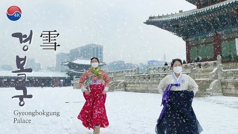 หิมะตกหนัก: พระราชวัง GYEONGBOKGUNG ทิวทัศน์หิมะที่สวยงาม ผู้หญิงในกรุงโซลสวมชุดฮันบก