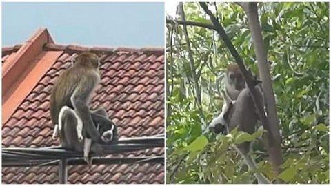 ระทึก! ลิงป่าลักพาตัวลูกหมาไปเลี้ยงบนต้นไม้ สุดท้ายตื่นเสียงประทัดยอมปล่อยแต่โดยดี (มีคลิป)