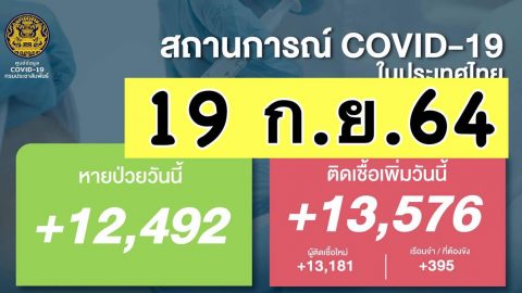 โควิดไทยวันนี้ ติดเชื้อใหม่ 13,576 ราย หายป่วย 12,492 ราย