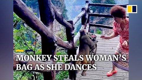 จีน: ลิงขโมยกระเป๋าผู้หญิงในขณะที่เธอเต้นรำ