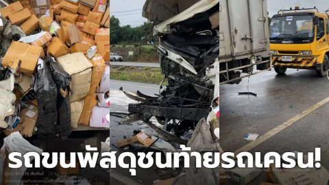 กล่องพัสดุเกลื่อนกลาด! รถขนพัสดุชนท้ายรถเครน!!!