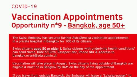 สถานทูตสวิสในไทย แจ้งให้พลเมืองสวิสลงทะเบียนฉีดวัคซีน