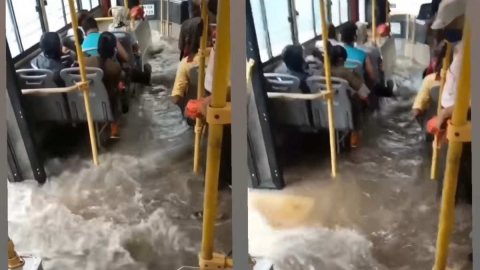 น้ำท่วมหนักทะลักเข้ารถเมล์! แบบนี้พายเรือยังได้เลย!!!