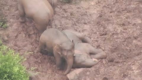 โขลงช้างป่าพเนจรของจีนกำลังอาบโคลนสีแดงในเมืองหยูซี