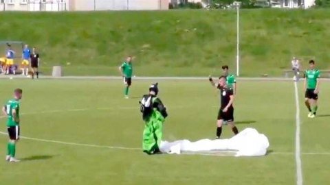 นักกระโดดร่มชูชีพ ตกลงมาขัดจังหวะการแข่งขันฟุตบอลในแมตช์ที่ 5 และถูกใบเหลืองโดยผู้ตัดสิน
