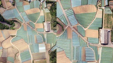 ภาพถ่ายแปลงผักทางอากาศ ลวดลายเหมือนการเย็บปะติดปะต่อกันในเมือง Miura . ทางตะวันออกของญี่ปุ่น