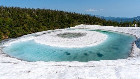 ปรากฏการณ์ธรรมชาติ '' Dragon Eye'' เกิดขึ้นในแอ่งน้ำบนภูเขาน้ำแข็งทางตอนเหนือของญี่ปุ่น