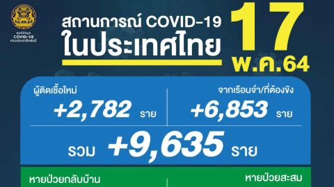 โควิดวันนี้ (17 พ.ค.64) ติดเชื้อเพิ่ม 9,635 ราย