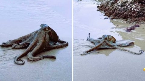 สาวออสซี่ถึงกับประหลาดใจ พบหมึกยักษ์ตัวเป็นๆ กำลังเดินเล่นบนชายหาด (มีคลิป)