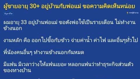 หนุ่มถาม"30+อยู่บ้านเฉยๆพ่อให้รายเดือน บอกแฟนพี่ทำงานธุรกิจครอบครัว " ขอคำปรึกษาในโซเชียล