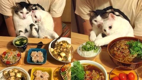 คู่รักชาวญี่ปุ่นจับภาพทุกช่วงเวลาที่แมวเฝ้าดูพวกมันกิน