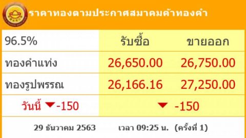 ลงเยอะสุดในประวัติศาสตร์ ราคาทองคำ วันนี้ 29 ธ.ค. 63