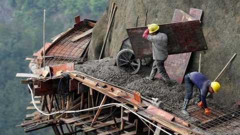 คนงานชาวจีนสร้างถนนบนภูเขาสูงจากพื้นหลายพันฟุต