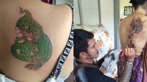 แก้รอยสักนาคีน้อยกลายเป็นพญานาคจากฝีมือช่างสักระดับประเทศ จากกรณีสักไม่ตรงปก