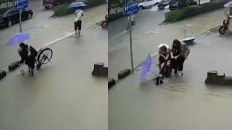 ผู้คนที่ผ่านไปมาช่วยคนขี่จักรยานที่ตกลงไปในหลุมลึก
