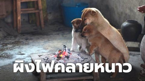 ฉลาดแสนรู้! ภาพถ่ายแม่สุนัขและลูกๆในจีนนั่งล้อมวงรอบกองไฟในวันที่หนาวเหน็บ