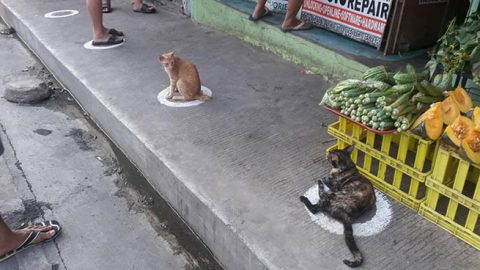 แมวจรจัดครอบครองเครื่องหมายเว้นระยะทางสังคม (social distancing) ในตลาดที่ฟิลิปปินส์