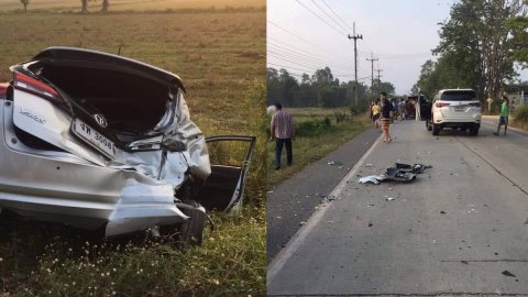 เก๋งจอดใส่บาตรพระข้างทาง ถูก Fortuner ชนเจ็บ