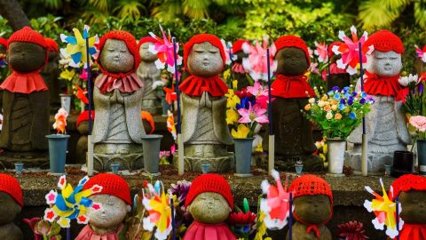 รูปปั้นหินสวมผ้ากันเปื้อนสีแดงและหมวกสีแดง กับพิธีไว้ทุกข์ของคนญี่ปุ่น