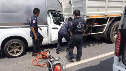 รถยนต์กระบะชนท้ายรถบรรทุก10ล้อ ทำให้มีผู้บาดเจ็บชาย 1ราย ติดค้างภายในยานพาหนะ