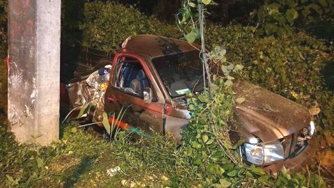 ทหารขับรถกระบะเสียหลักพุงชนเสาไฟฟ้าเสียหายกลางดึก