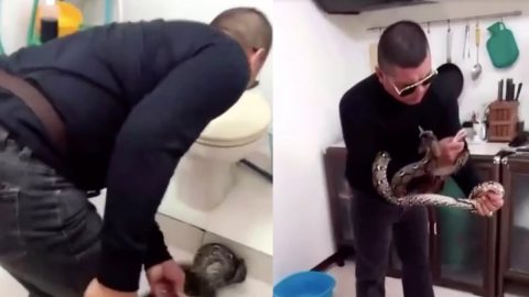 ระทึก งูเหลือมโผล่ชักโครก ก่อนเลี้อยกำแพงหนี