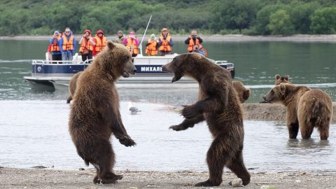 ช่างภาพชาวรัสเซียแบ่งปันภาพถ่ายหมีสีน้ำตาลสองตัวต่อสู้กัน ท่ามกลางสายตาของนักท่องเที่ยว