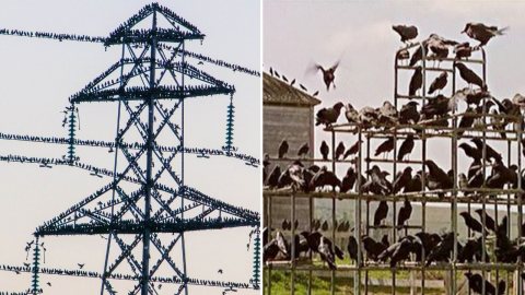 ภาพฝูงนกประหลาดเกาะเสาไฟฟ้าพร้อมส่งเสียงสะท้อนที่น่าขนลุก เหมือนในภาพยนตร์ The Birds