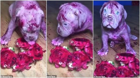 อร่อยจนเละเทะ! ลูกสุนัขบูลด็อกกินแก้วมังกรเนื้อสีแดงจนเนื้อตัวเปรอะเปื้อน เห็นแล้วโกรธไม่ลง (มีคลิป)