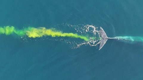 ไม่ได้เห็นกันบ่อยๆ วาฬสีน้ำเงินอึโชว์กล้องนอกชายฝั่งออสเตรเลีย และเปลี่ยนน้ำทะเลให้เป็นแนวสีเหลืองสดใส