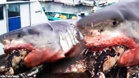 พบซากฉลามขาวยักษ์หนัก 2,000 กิโล นอนตายในตาข่ายขณะมีเต่ายักษ์คาอยู่ในปาก