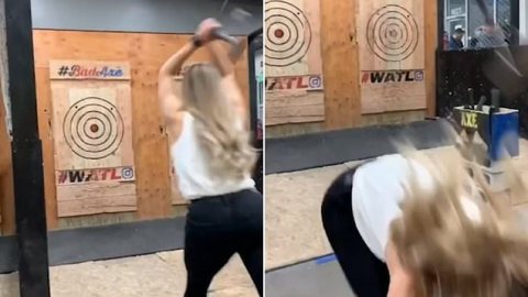 โชคดีที่หลบทัน! หญิงสาวเล่นขว้างขวาน โชคร้ายเด้งกลับเฉียดหัวนิดเดียว (มีคลิป)