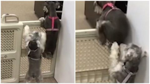 แสบจริงๆ น้องหมาช่วยกันดันหลังปีนข้ามรั้วกั้น เพื่อไปหาอาหารกิน (มีคลิป)