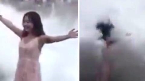 เกือบทิ้งชีวิต! นักท่องเที่ยวสาวยืนถ่ายรูปริมผาที่เกาะบาหลี ซวยหนักมากโดนคลื่นยักษ์ซัดจนได้รับบาดเจ็บ (มีคลิป)